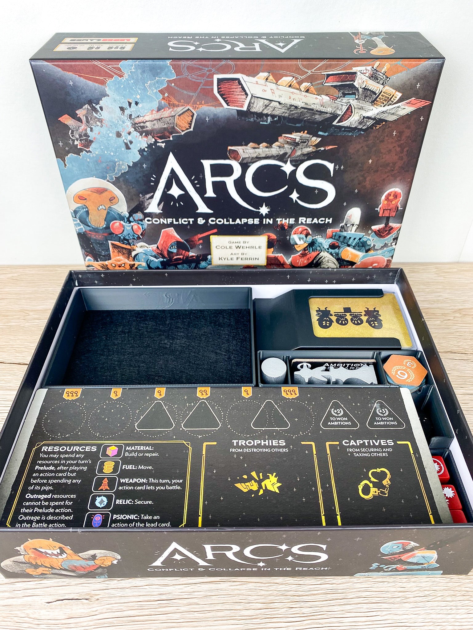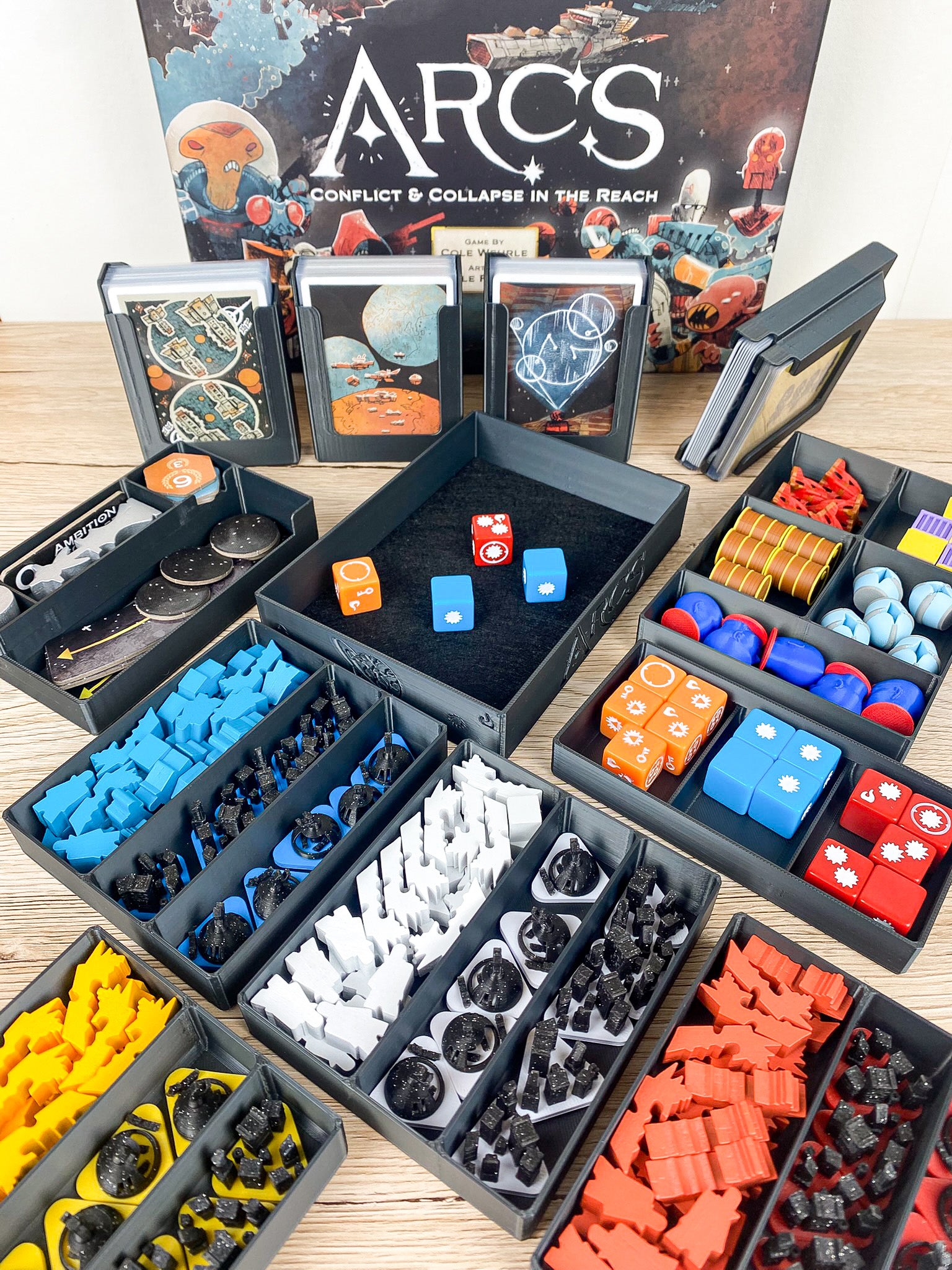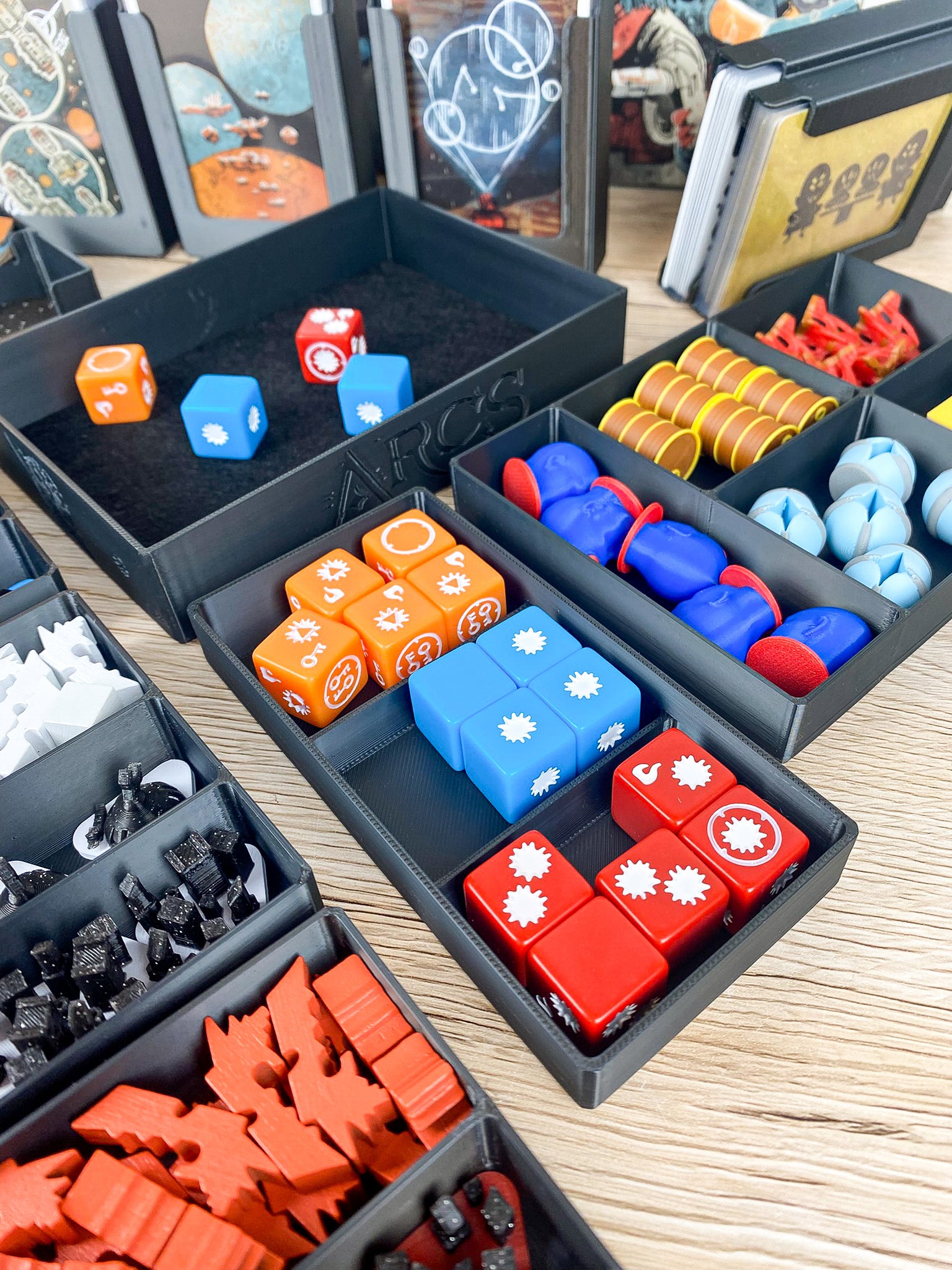 ✔️ Würfel-Arena im Arcs-Stil – spezielles Würfel-Tray, das als Würfelschale dient und perfekt ins Design integriert ist. Filz auf dem Boden sorgt für ein angenehmes Würfelerlebnis