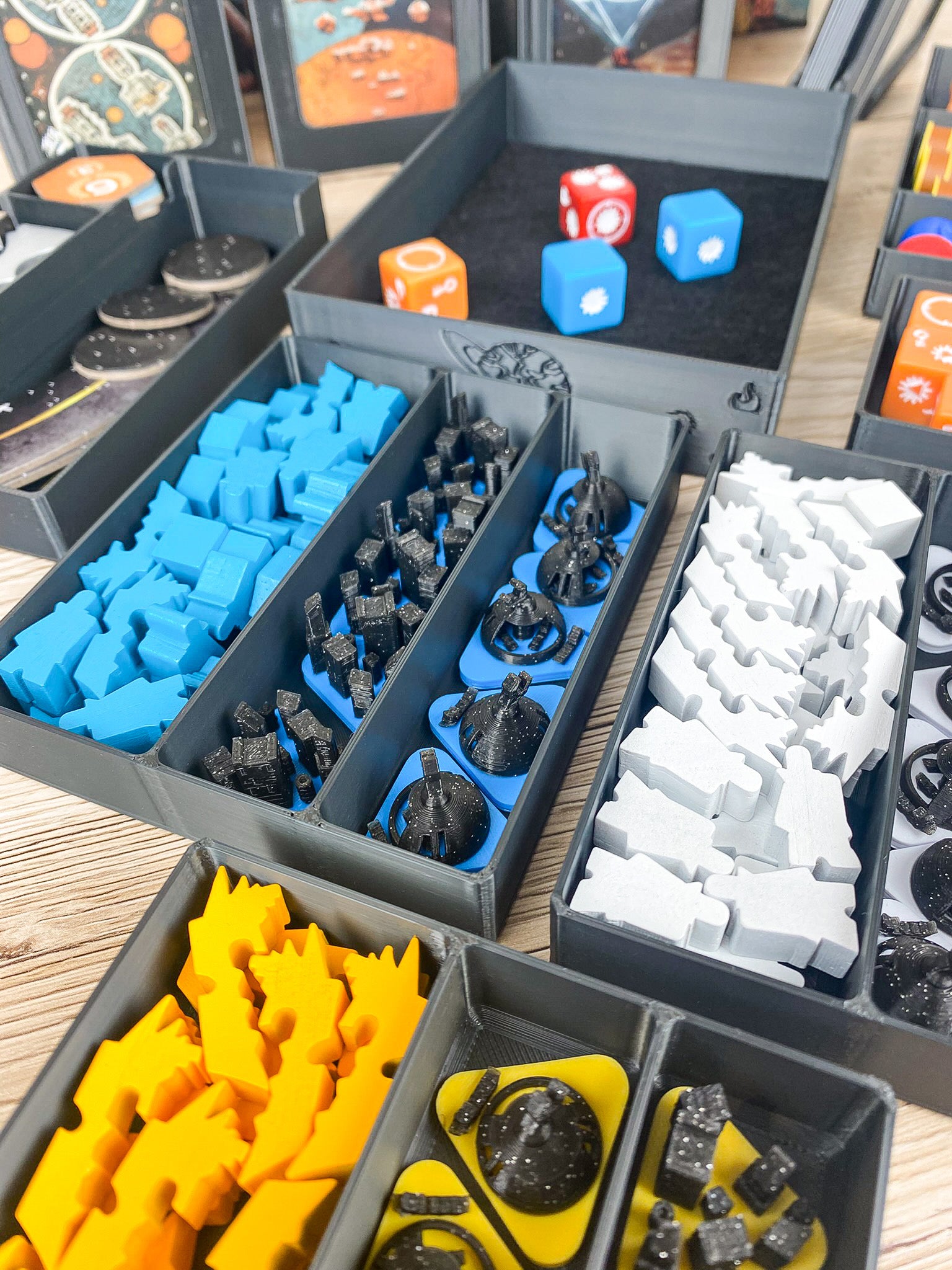 Ob Ressourcen, Gebäude oder Würfel – jedes Teil hat seinen festen Platz. So kannst du dich ganz auf deine galaktischen Strategien konzentrieren, statt ewig zu sortieren.
