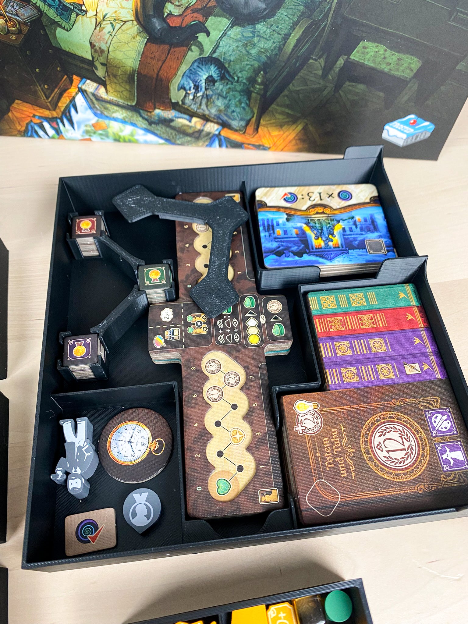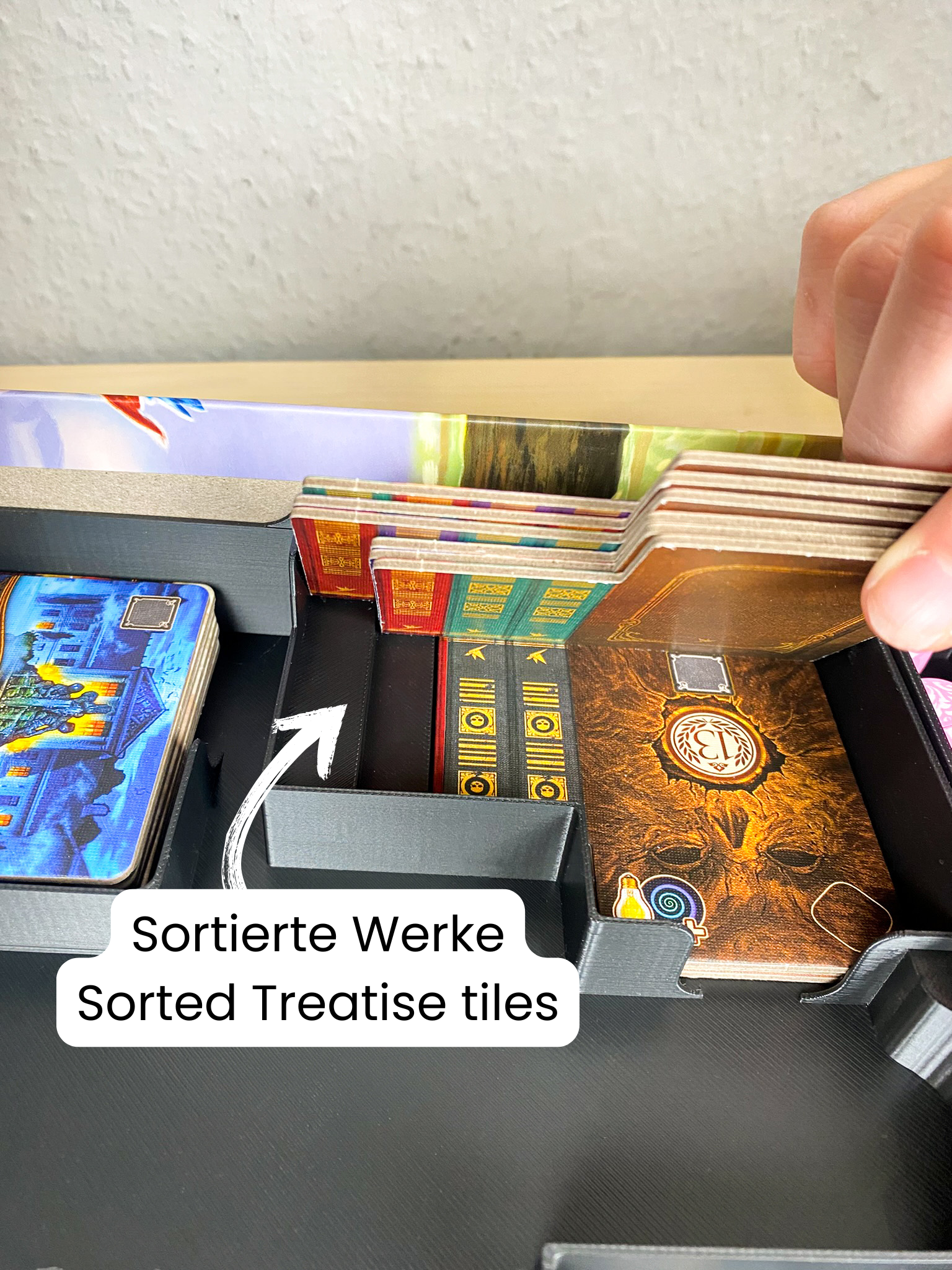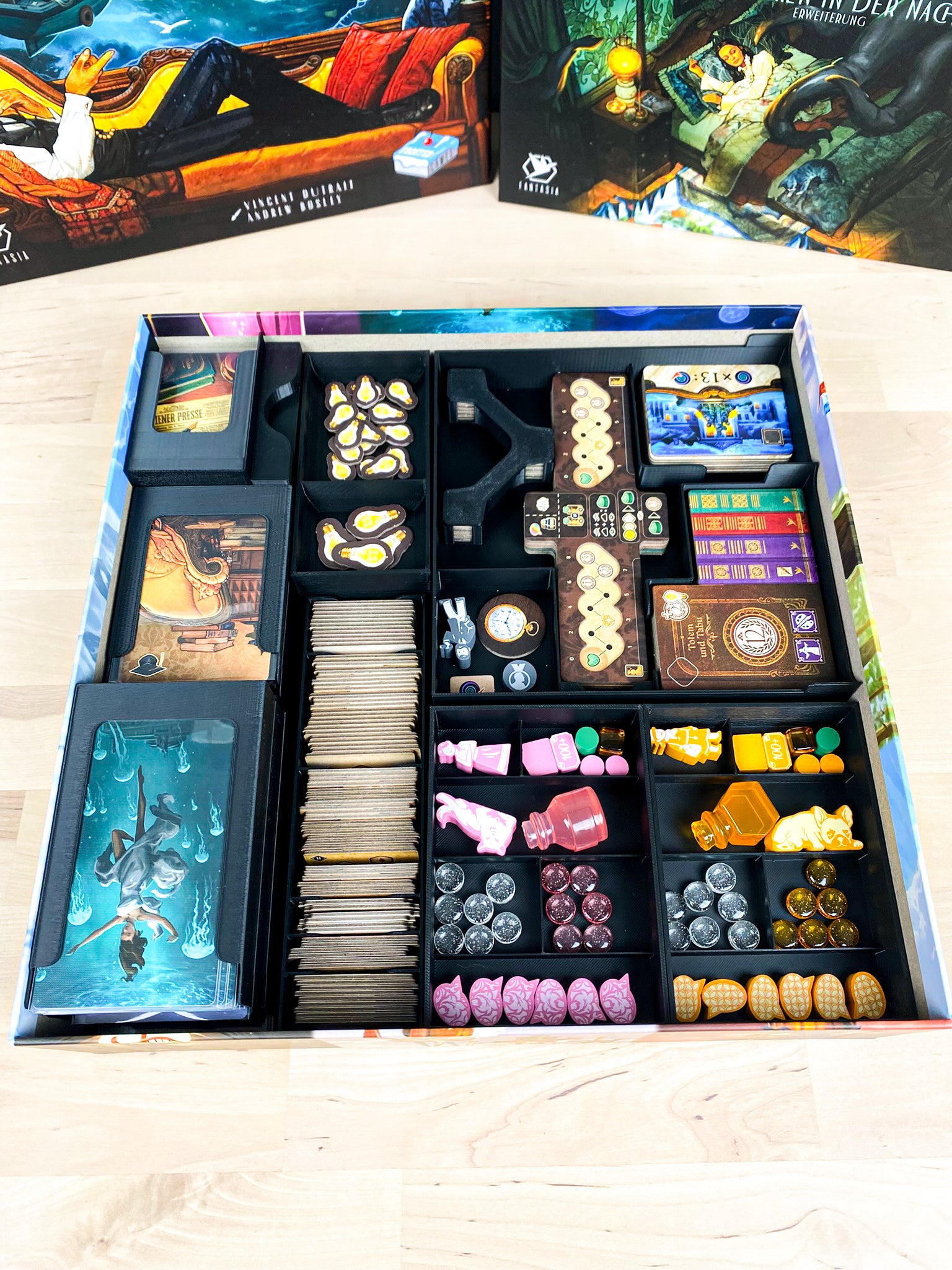 Dieser Einsatz ist speziell entworfen, um alle Komponenten sicher und organisiert unterzubringen. Kein Chaos mehr in der Spielschachtel – jedes Plättchen, jede Karte und jeder Spielstein findet seinen perfekten Platz. Dank der cleveren Fächer und leicht zugänglichen Ablagen sparst du Zeit beim Aufbau und kannst direkt ins Spiel eintauchen.