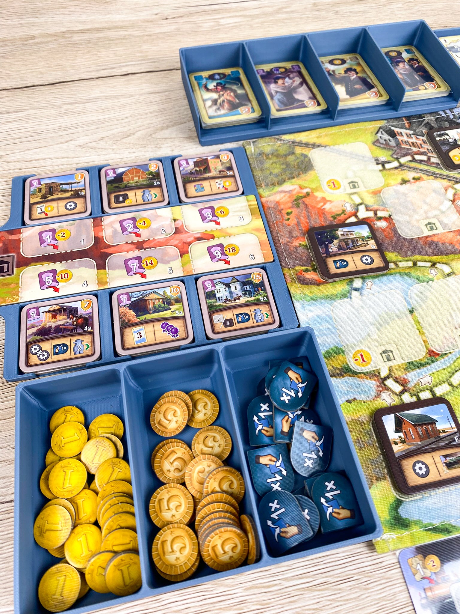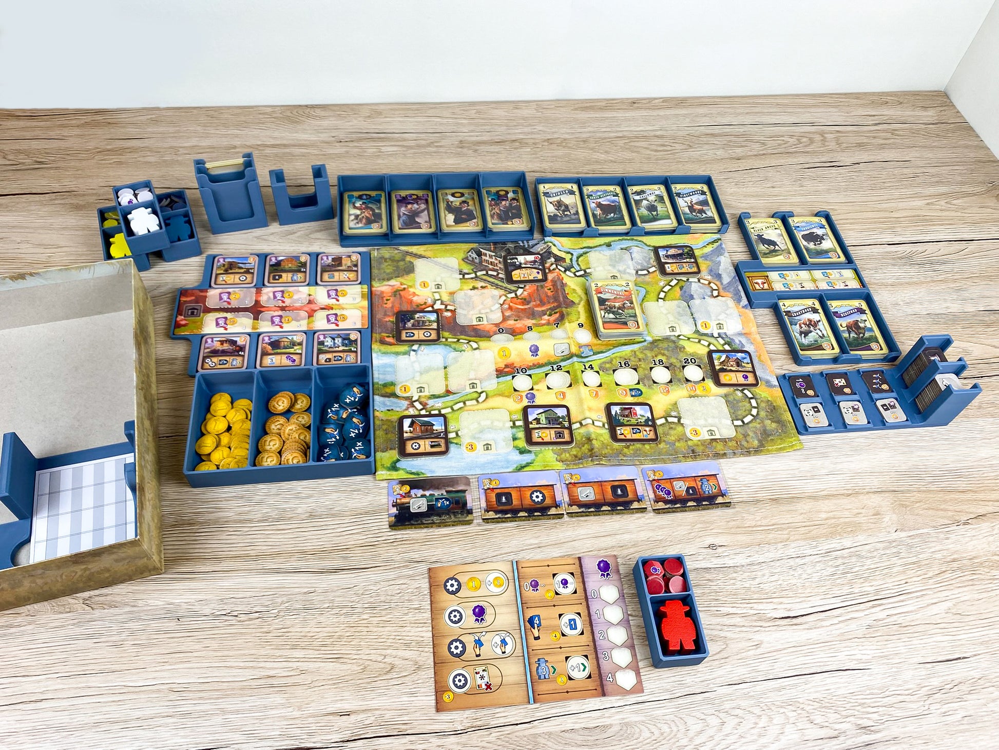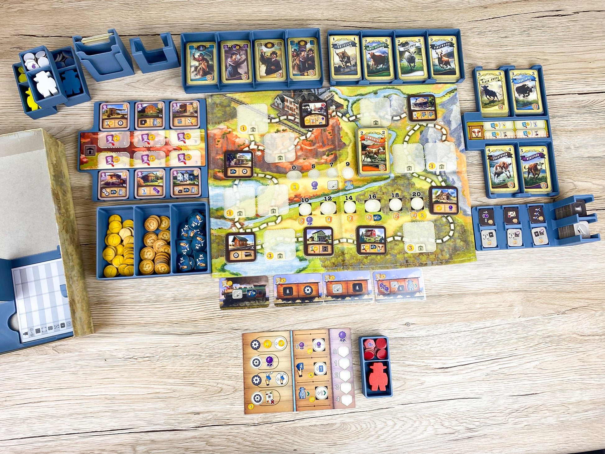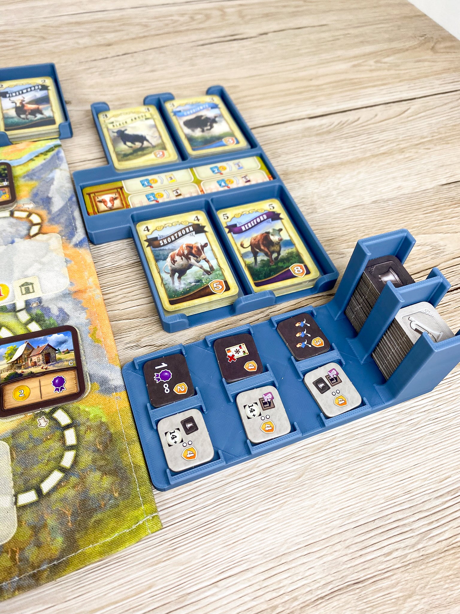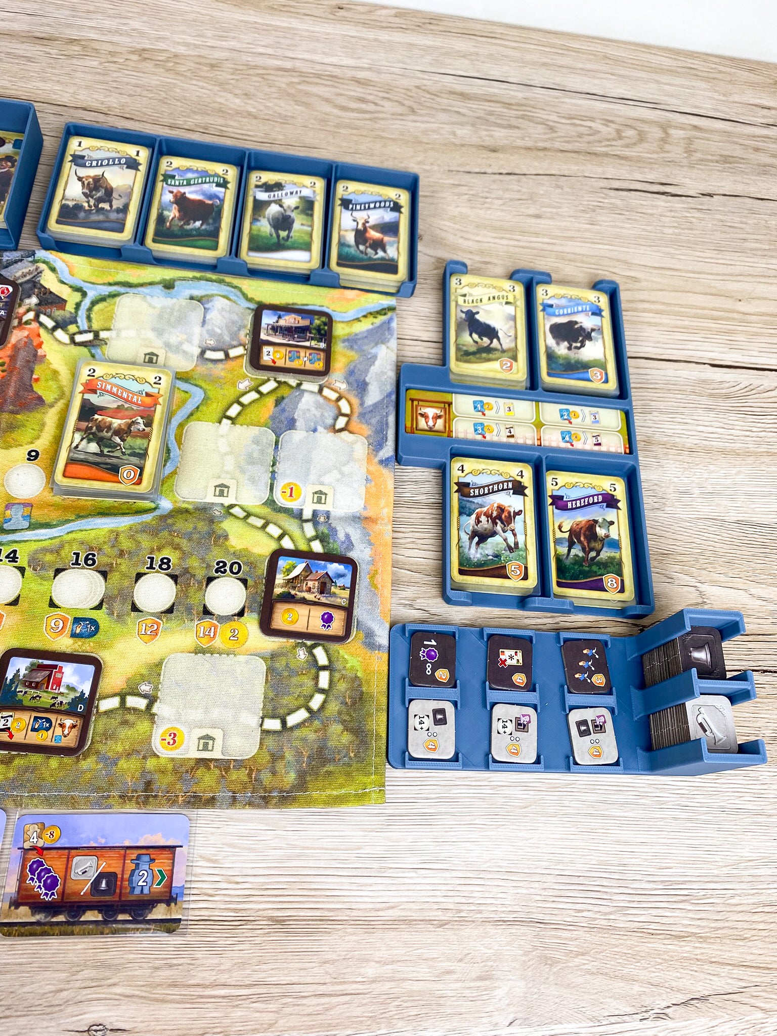 Der zentrale Teil unseres Inserts ist gleichzeitig das Spielfeld: Rindermarkt, Gebäudemarkt, Ziel- und Bonusplättchen, Münzen, Tauschplättchen und Arbeiter sind alle übersichtlich vorsortiert – einfach die Trays herausnehmen und direkt loslegen. Kein Sortieren von Gebäudeplättchen oder Rinderkarten notwendig!