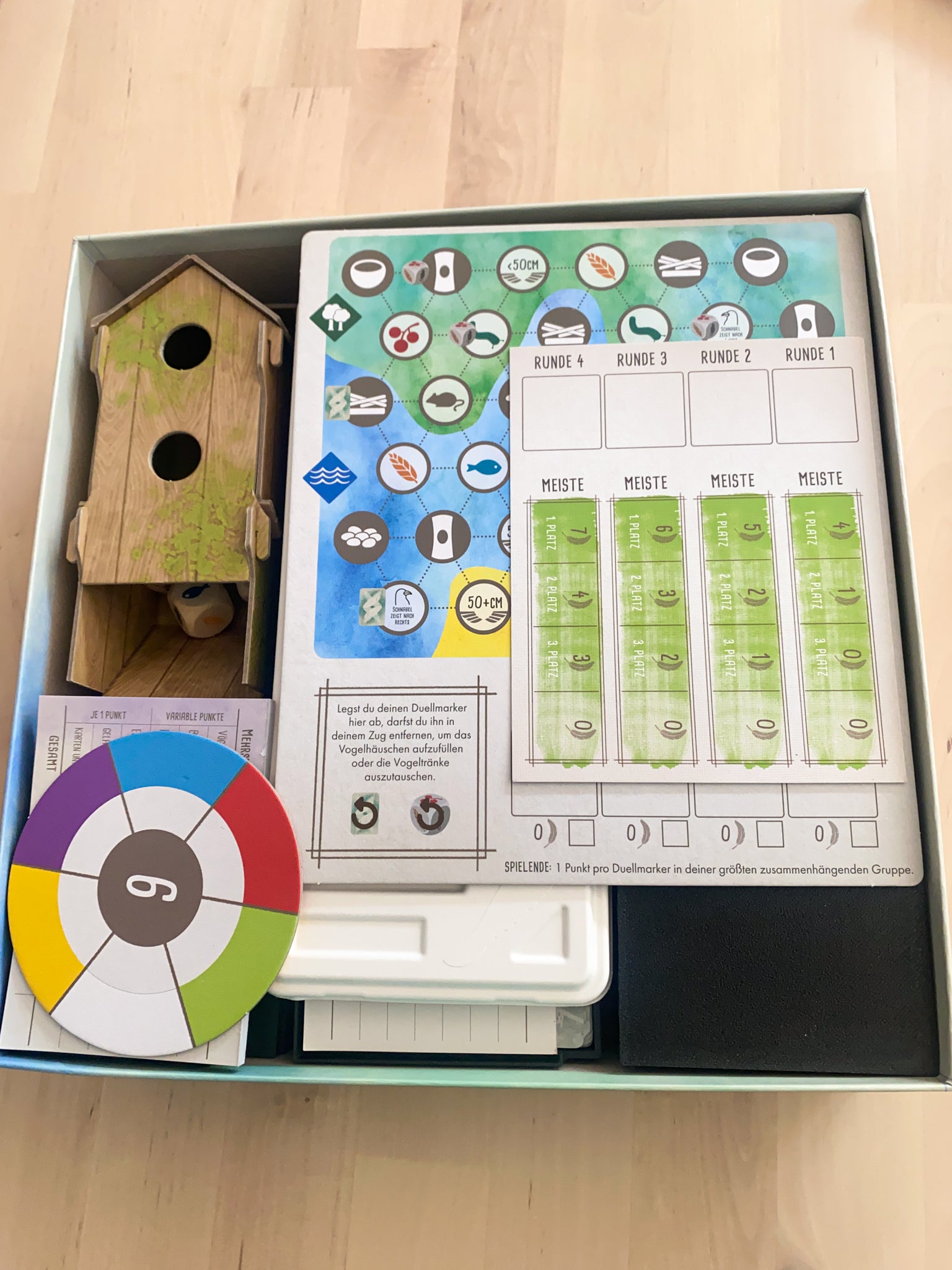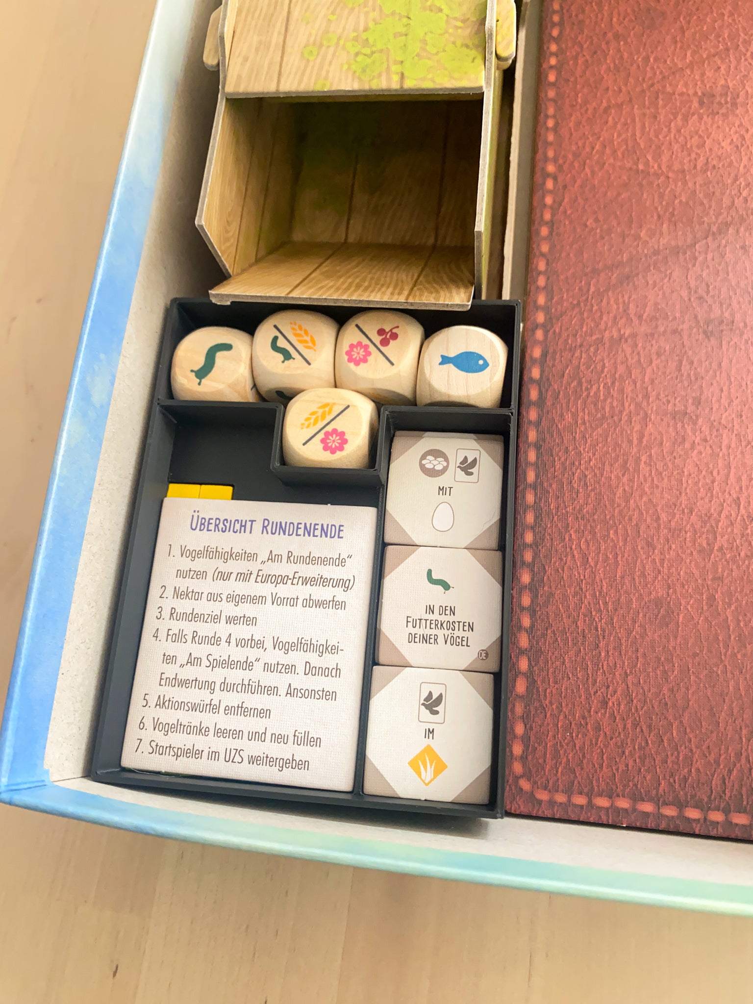 Mit diesem Einsatz passen alle wichtigen Komponenten des Grundspiels und der Erweiterungen in die Box des Grundspiels. Neben den grundlegenden Spielsteinen passen alle Mehrspieler-Karten, zwei Wertungsblöcke, vier Spielertableaus, das Vogelhäuschen, eine Vogeltränke und die Anhänge in die Schachtel. Außerdem ist eine praktische Aufbewahrung für die Eier und die Futtermarker enthalten, die von beiden Seiten des Spielertisches bequem erreichbar ist. Nicht vorgesehen für den Einsatz sind die Komponenten für das Solo-Spiel sowie zusätzliche Bretter wie die flachen Vogeltränken (obwohl sie unter Umständen passen könnten oder gegen bestimmte Anhänge getauscht werden können).