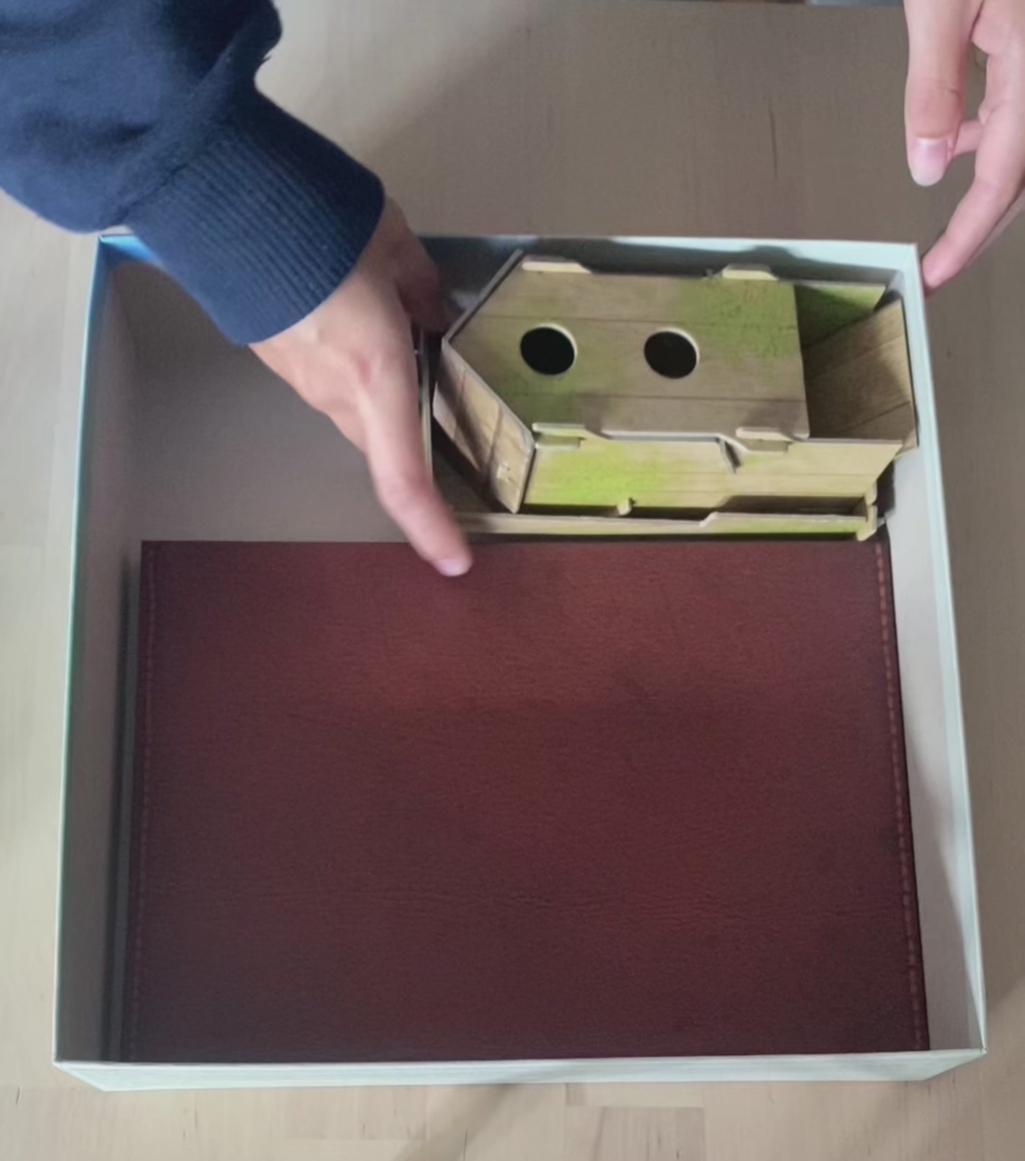 An den Unterseiten der einzelnen Schachteln sind Löcher eingebaut, um die Elemente ganz einfach mit dem Finger rauszuschieben. Die Kartenhalter bieten Platz für Karten mit Sleeves (bis zu 100 Microns) und haben zudem genug Raum für potentielle zukünftige Erweiterungskarten.