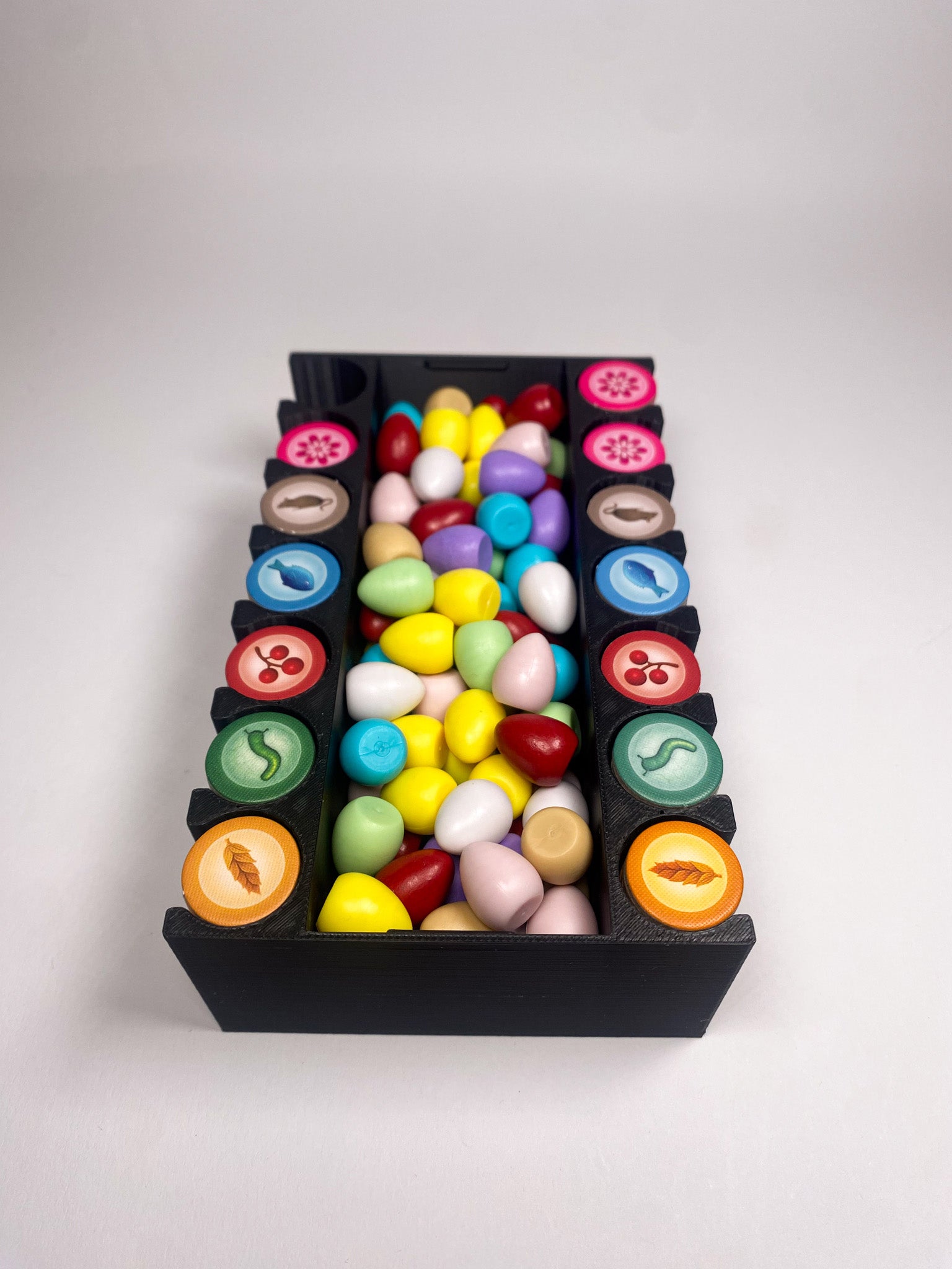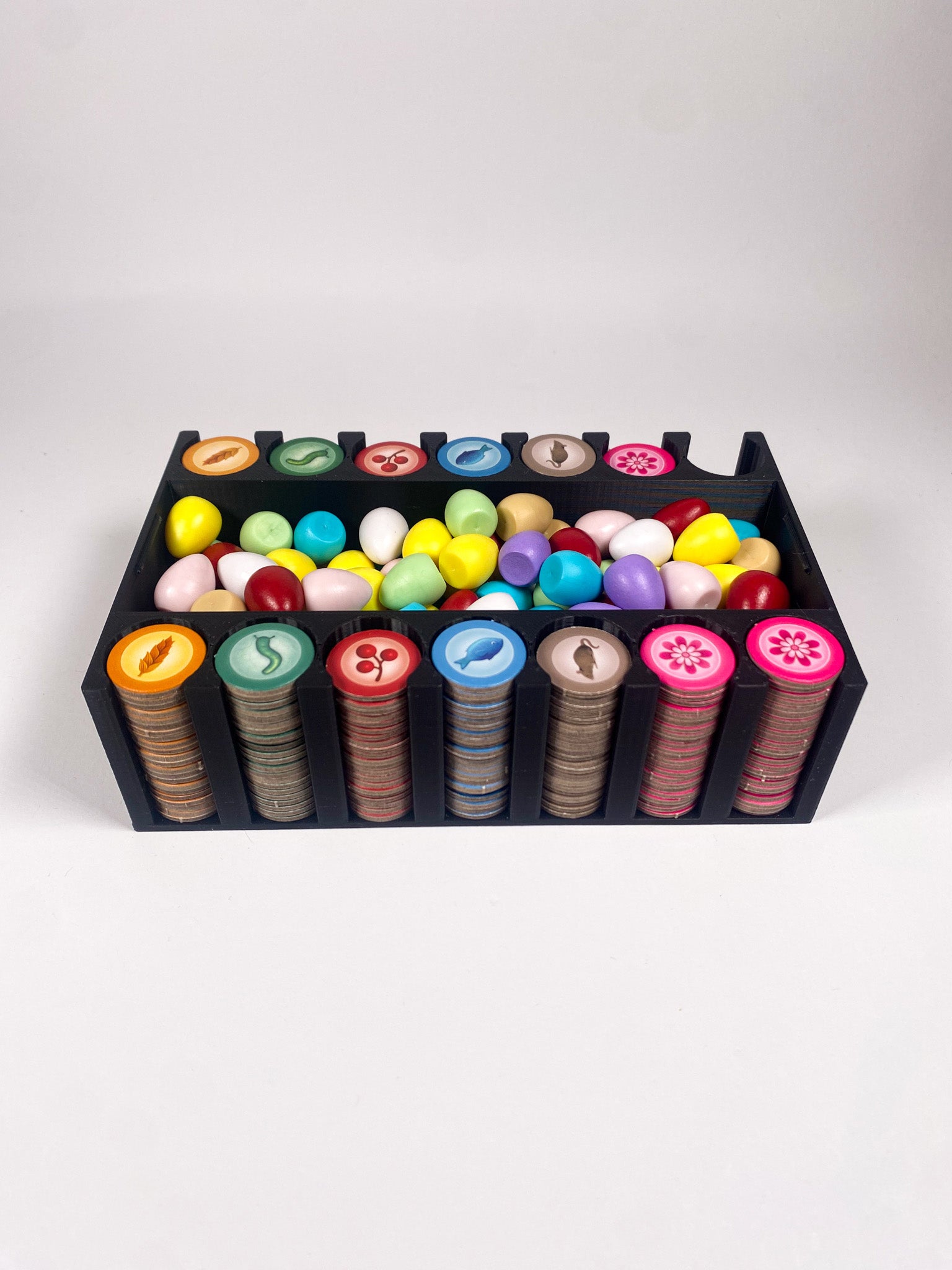 Dieser Organizer bringt Ordnung und Stil in dein Flügelschlag Spiel. Er bietet Platz für alle Futtermarker inklusive Nektar sowie für alle Eier inklusive aller Eier aus Erweiterungen und sorgt dafür, dass alles übersichtlich und für alle Spieler griffbereit bleibt. Kein Suchen und keine Unordnung mehr – so kannst du dich voll und ganz auf dein Spiel konzentrieren! 🦅