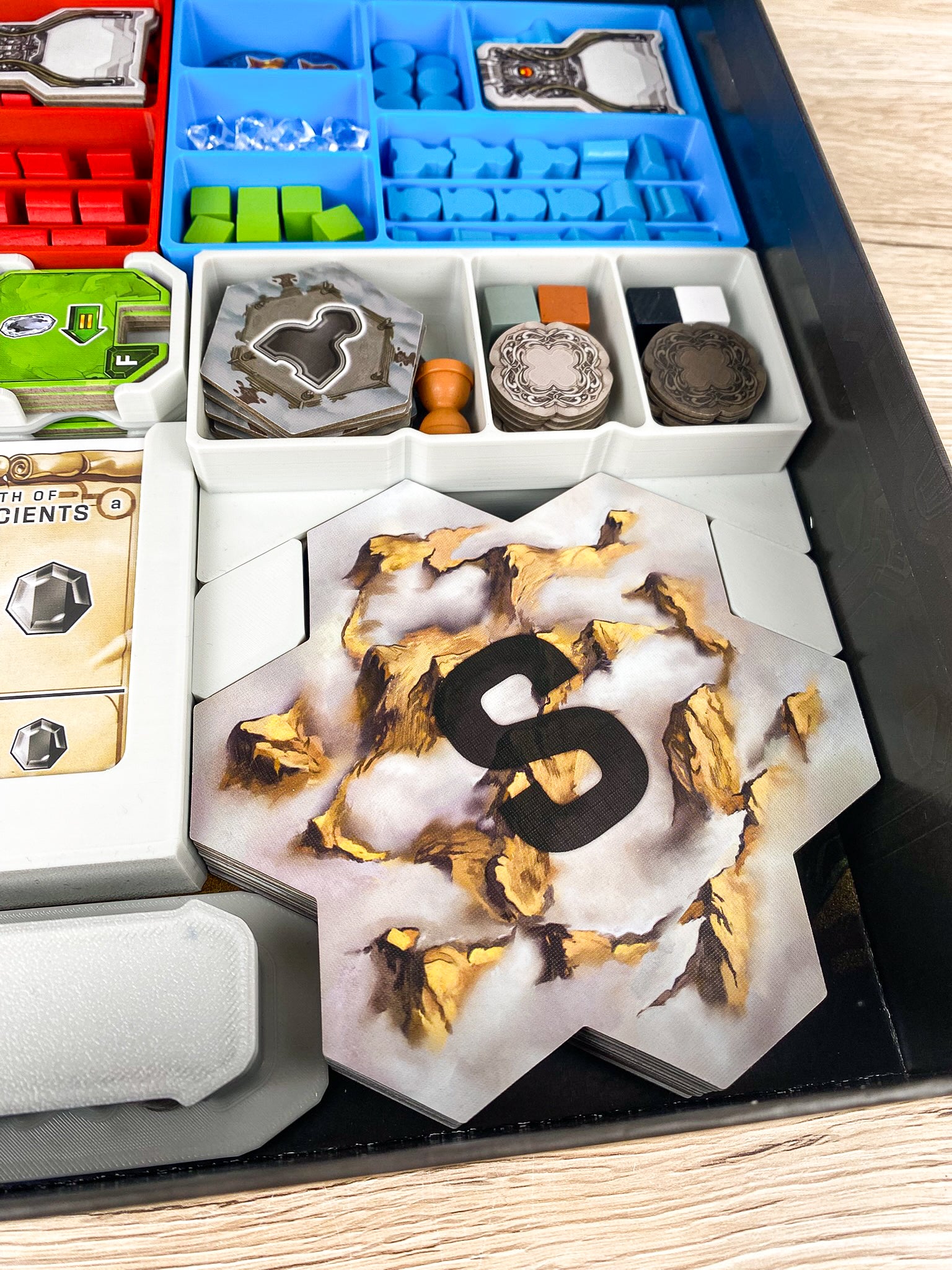 Jedes Teil hat seinen festen Platz. So werden auch die Regionsplättchen vom Insert eingespannt und rutschen nicht durch die Schachtel. Die Komponenten der Stämme werden sauber getrennt. Die vertikale Lagerung des Spiels ist problemlos möglich.