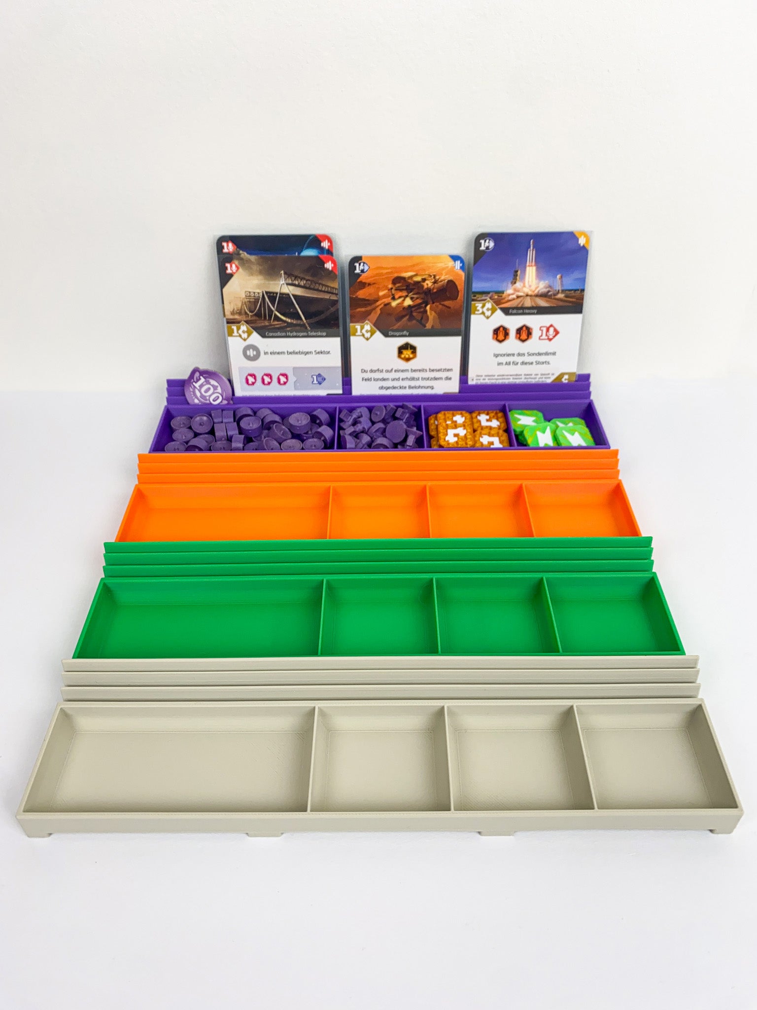 🌌 Karten verwalten: Drei Einschübe unter dem Tray ermöglichen eine durchdachte Trennung von abgeschlossenen, offenen / goldenen Missionen sowie Einkommenskarten.